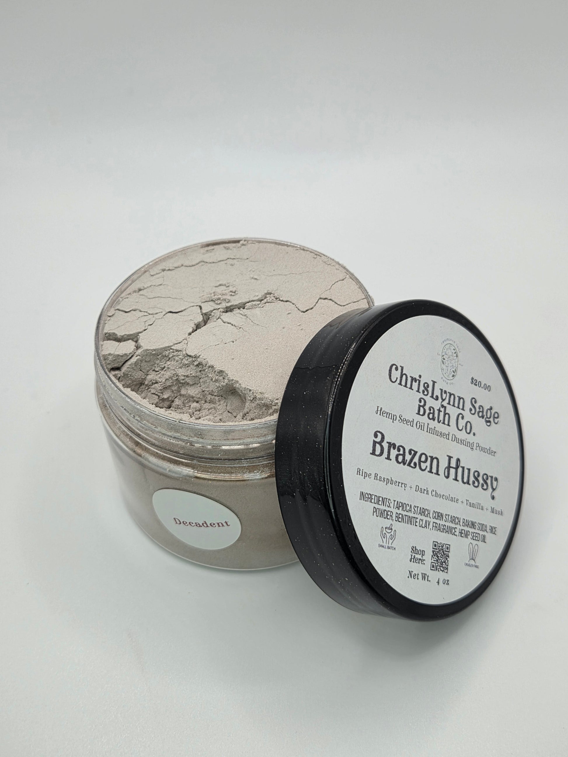 Ingredients: Tapioca Starch, Corn Starch, Baking Soda, Rice Powder, Bentonite Clay, Fragrance, Hemp Seed Oil